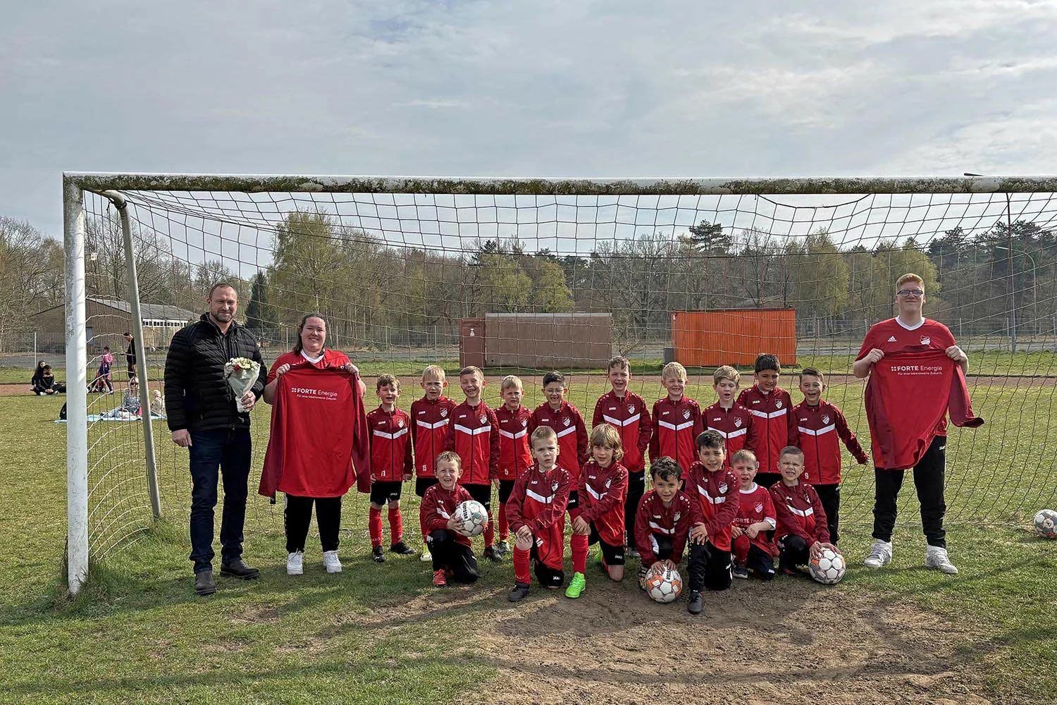 Bildunterschrift: Lisa-Marie Mavroidakis und Leon Lobb vom TSV Altenwalde präsentieren gemeinsam mit ihren Schützlingen und Dr. Thomas Kalkau, dem Geschäftsführer der Forte Energie, die neue Mannschaftsbekleidung für die U7 I und II.